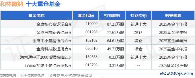 持有和林微纳最多的基金为金鹰核心资源混合A,目前规模为10.69亿元,最新净值2.5408(8月15日),较上一交易日上涨2.32%,近一年上涨75.46%。该基金现任基金经理为陈颖。